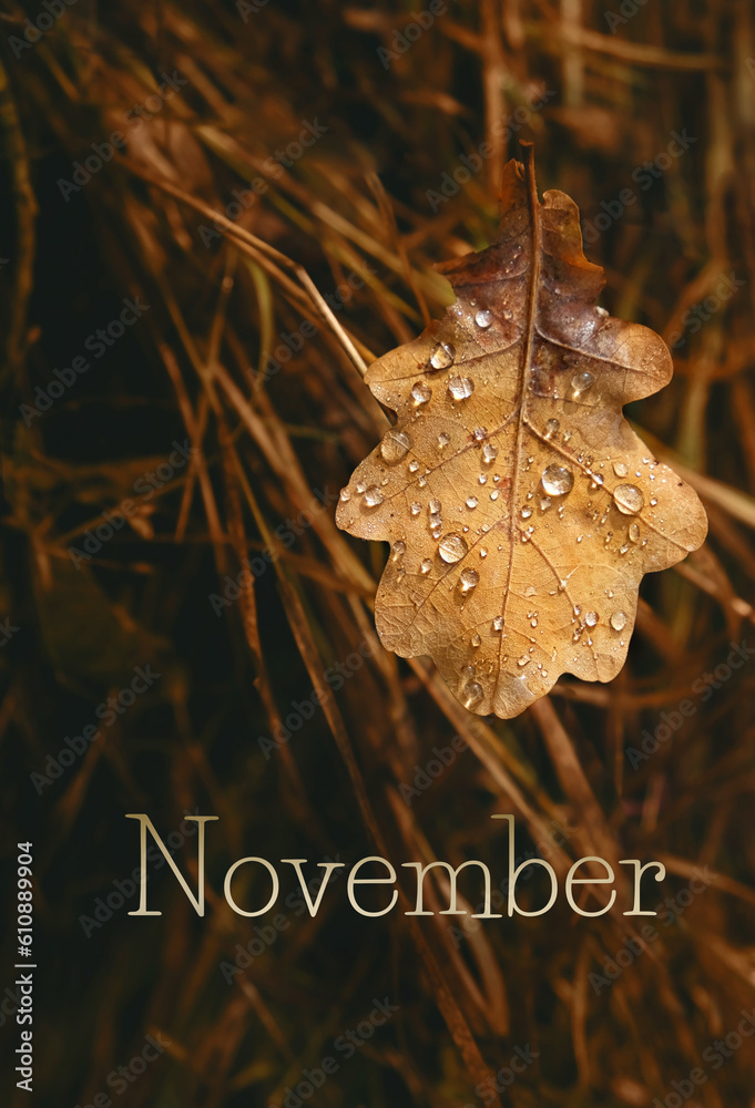 autumn oak leaf in raindrops on grass close up, dark abstract natural background. November concept. symbol of fall season. rainy weather.