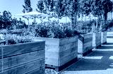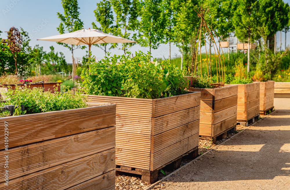 Vegetable garden with wooden raised beds for herbs, fruits and vegetables