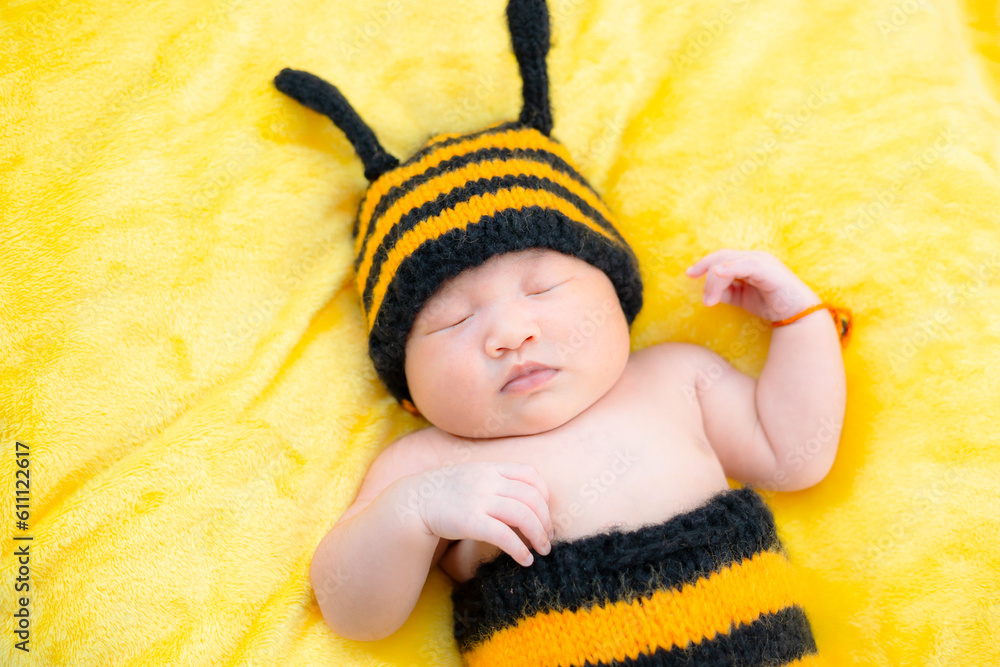 Asian Baby Girl dress in a bee costume,baby in bee costume,newborn baby in bee costume. newborn baby concept shot