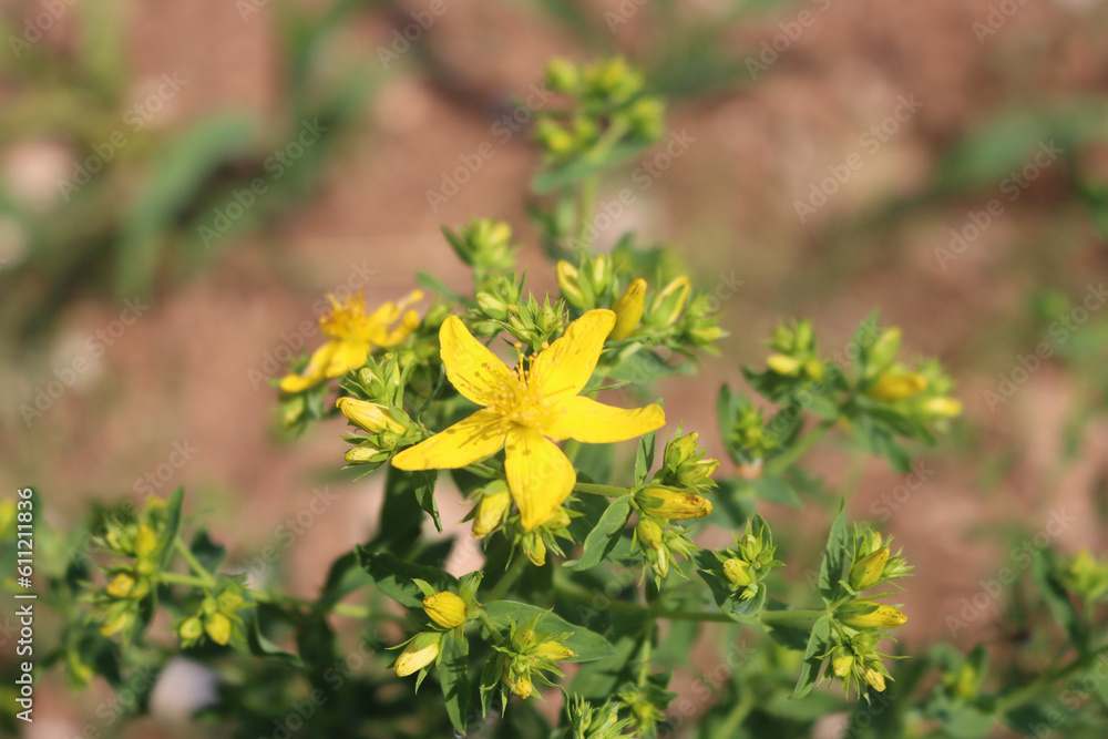 Close-up of St. John's wort yellow flowers. Hypericum perforatum plant in bloom on summer