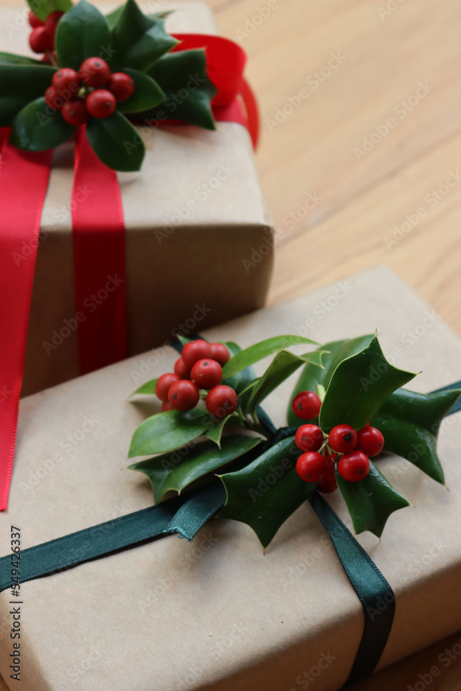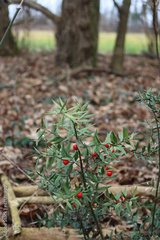 Evergreen Butcher's Broom bush with ripe red fruits . Ruscus aculeatus in the italian countryside