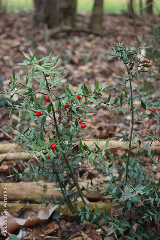Evergreen Butcher's Broom bush with ripe red fruits . Ruscus aculeatus in the italian countryside