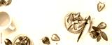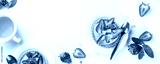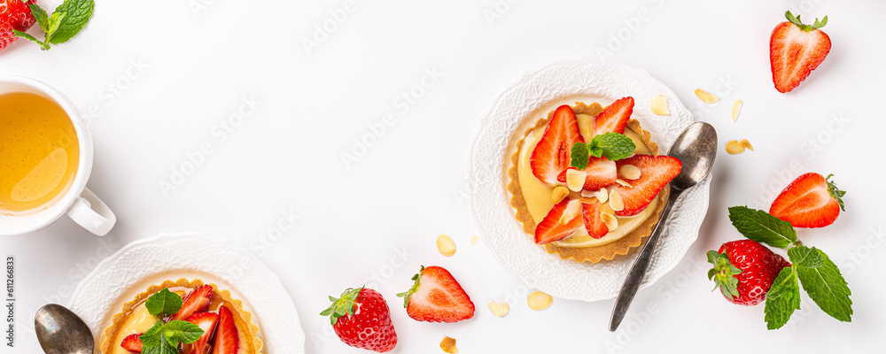 Banner with small tartlet pastries with vanilla custard, topped with strawberry fruits and almond sprinkles and tea over white background. Concept of homemade sweet pastries. Copy space, top view