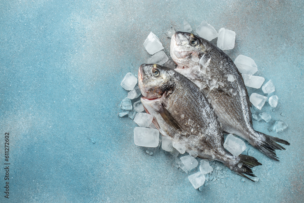 Raw fresh dorado or sea bream on ice cubes on blue concrete background. place for text, top view