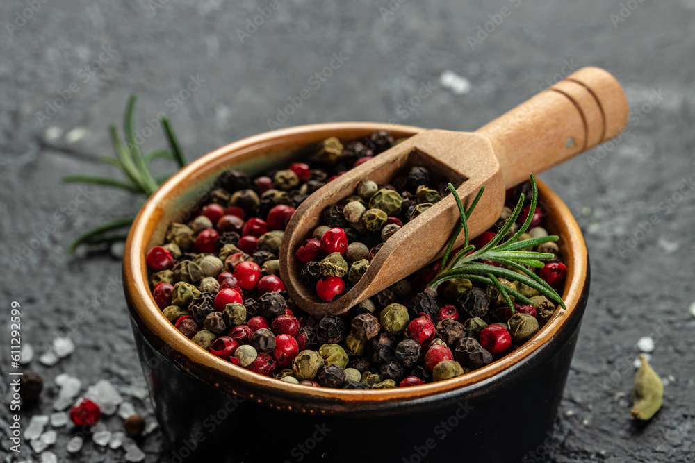 Pepper mix. Black, red and white peppercorns. Food recipe background. Close up