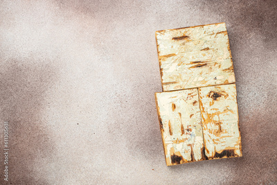 wooden cutting board on concrete background. rustic style, Food cooking background. top view