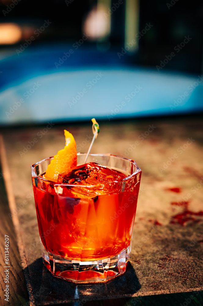 alcoholic cocktail in a glass stands on a table in a bar or restaurant