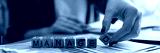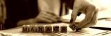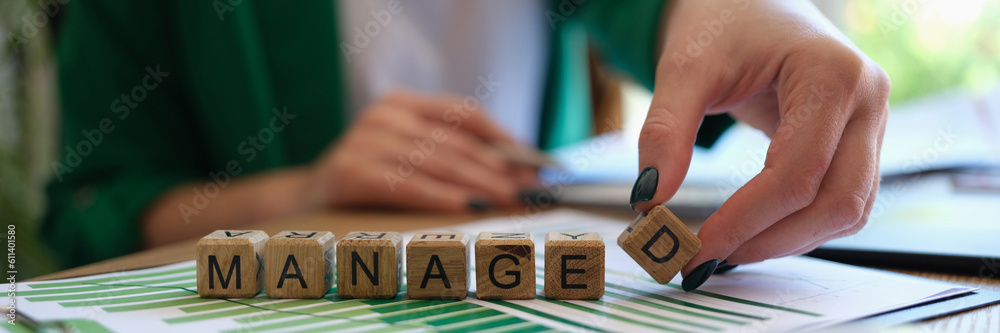 Woman collecting word managed with wooden cubes