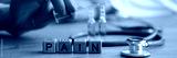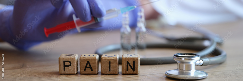 Female doctor hand in glove holding injection syringe with painkiller medicine