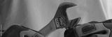 Person hands in protective work gloves holding spanner.