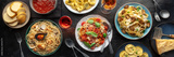 Pasta variety panorama on black. Italian food and drinks, overhead flat lay shot