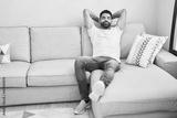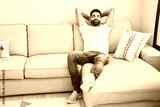 Young arab man relaxed with hands on head sitting on sofa at home