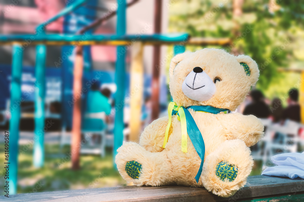 A yellow teddy bear with a yellow and blue ribbon on the background of a street sports ground.