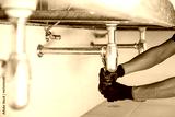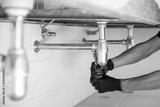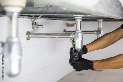 Technician plumber using a wrench to repair a water pipe under the sink. Concept of maintenance, fix water plumbing leaks, replace the kitchen sink drain, cleaning clogged pipes is dirty or rusty.