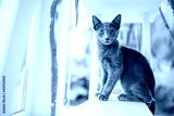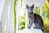Young playful Russian Blue kitten playing by the window. Gorgeous blue-gray cat with green eyes.
