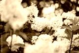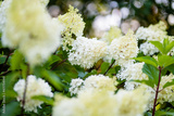 Tender flowers of hydrangea arborescens, backlit by the low evening sun in summer. Hortensia flowering in summer garden.