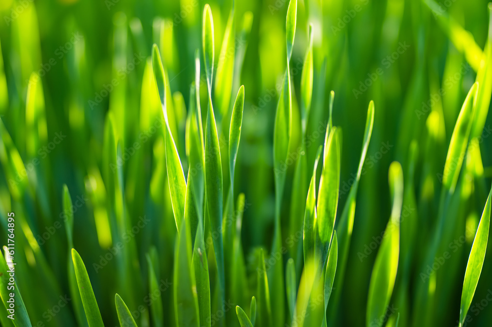 Lush uncut green grass in soft evening light. Perfect fresh lawn on summer evening.