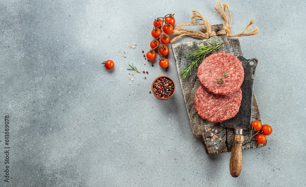 Raw mince beef meat Burger steak cutlets on a light background, Long banner format. top view