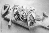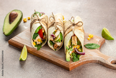 Burritos wraps with chicken, avocado, fresh tomatoes, limes on plate. Mexican dish. place for text, top view