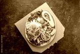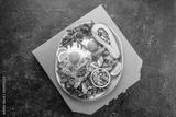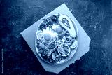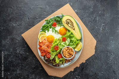 Keto plate of healthy food in a pizza box. Concept of healthy eating or fast food