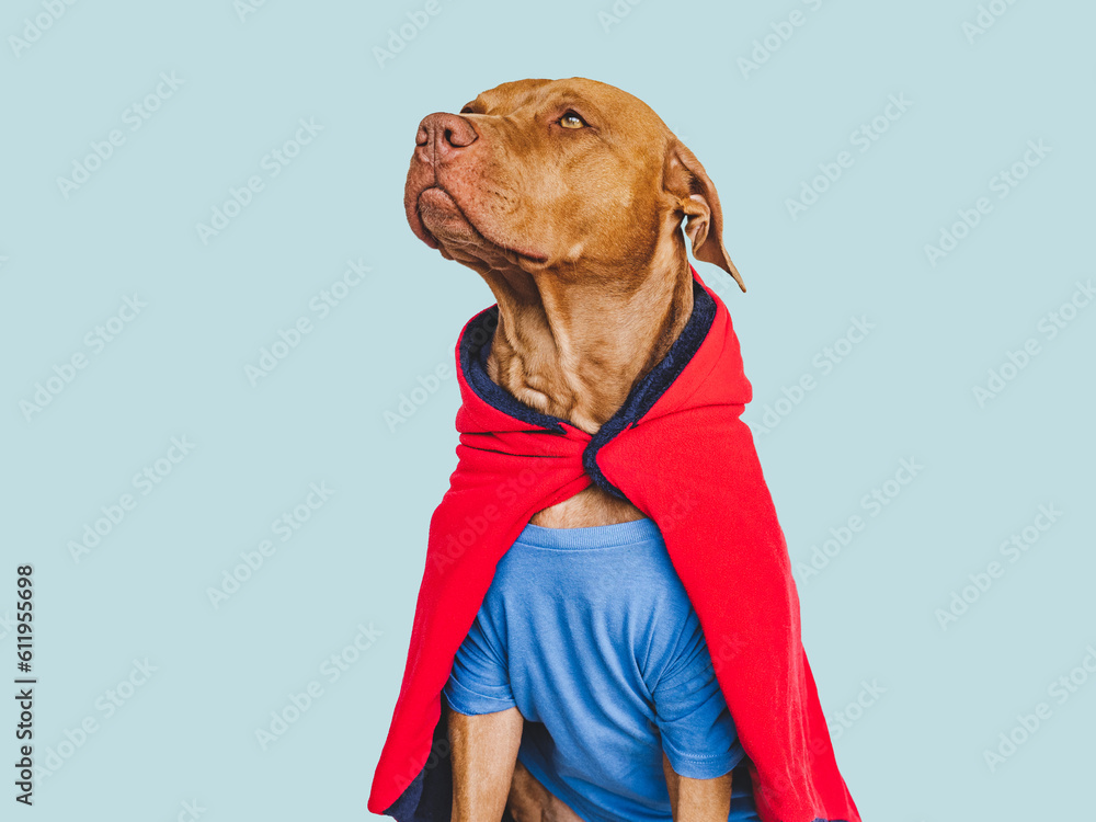 Cute brown puppy, Superhero costume and American Flag. Close-up, indoors. Studio shot. Congratulations for family, loved ones, friends and colleagues. Pet care concept