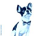 Charming puppy and a bow-tie in the colors of the American Flag. Close-up, indoors. Isolated background. Studio shot. Congratulations for family, loved ones, friends and colleagues. Pets care concept