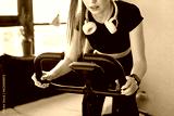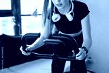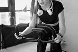 Home fitness workout woman training on stationary bike indoors. cropped redhead caucasian woman working out at home on the exercise bike, young female cycling for good health, engaged in sport