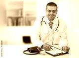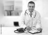 Arabian doctor in his office writing notes in his office.