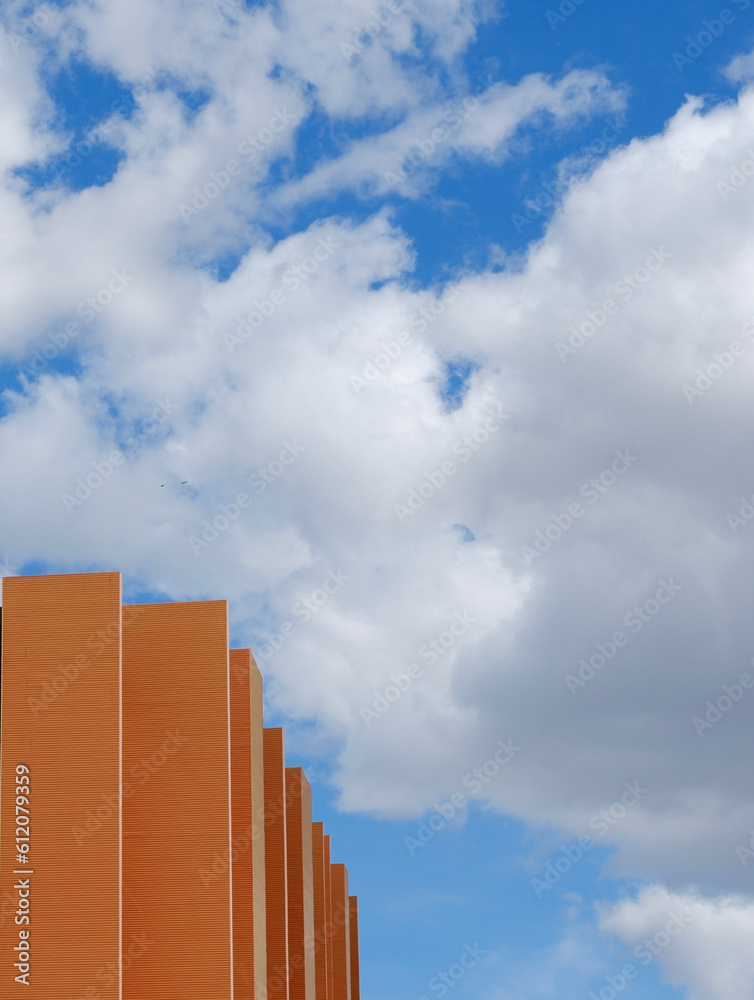 Minimal corner of modern building facade against blue cloudy sky. Minimalistic architecture detail. minimal urban background. Vertical photo