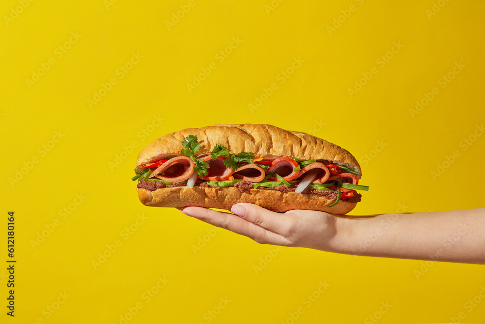 In the woman's hand is a Vietnamese bread filled with meat, rolls and pate served with vegetable on a yellow background. Advertising photo, Vietnamese street food. Front view, copy space