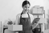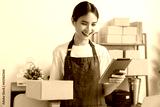 Startup small business, Young Asian woman checking online order on digital tablet and packing boxes for products to send to customers. working at the home office.