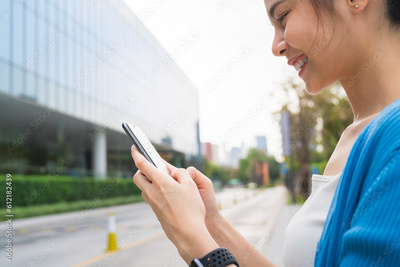 woman using smartphone in public areas, During leisure time. The concept of using the phone is essential in everyday life.