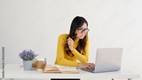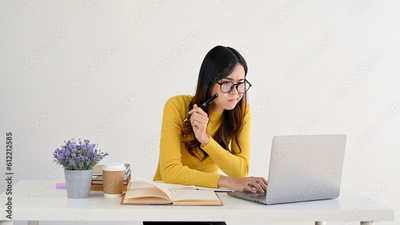 A doubtful Asian female student is looking at her laptop screen with hesitation