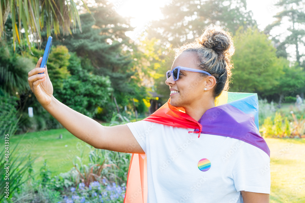 Young Latin happy woman wrapped in a rainbow flag, symbol of LGBT community, makes selfie on a mobile phone on a pride celebration in a city park. Human Rights, Equality, LGBT, Freedom and Happiness.