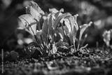 Macro shot of miniature shovel stuck in a black soil next to fresh green beet sprouts. Home gardening and growing vegetables concept. Planting young beets in the garden. Harvesting beetroot concept