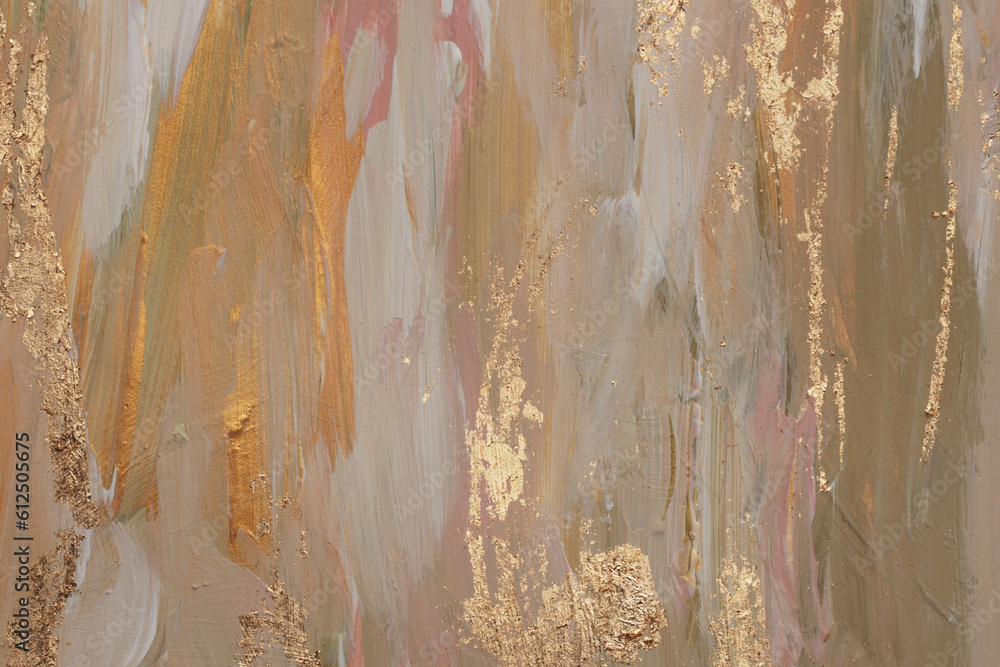 Art oil and acrylic smear blot canvas painting with gold line elements. Abstract beige pastel color stain brushstroke texture background.