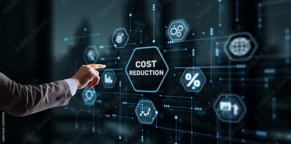 Cost reduction business finance concept. Businessman clicks virtual screen