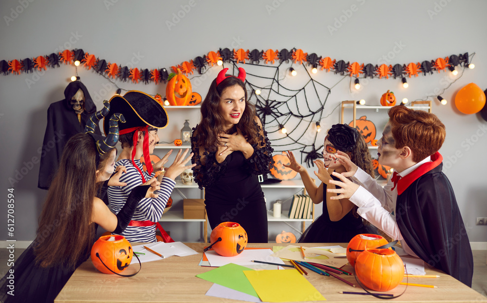 Woman entertainer play with children engaged in activity on Halloween party in decorated home. Smiling female entertain kids have fun on all saint eve in kindergarten. Fall holiday concept.