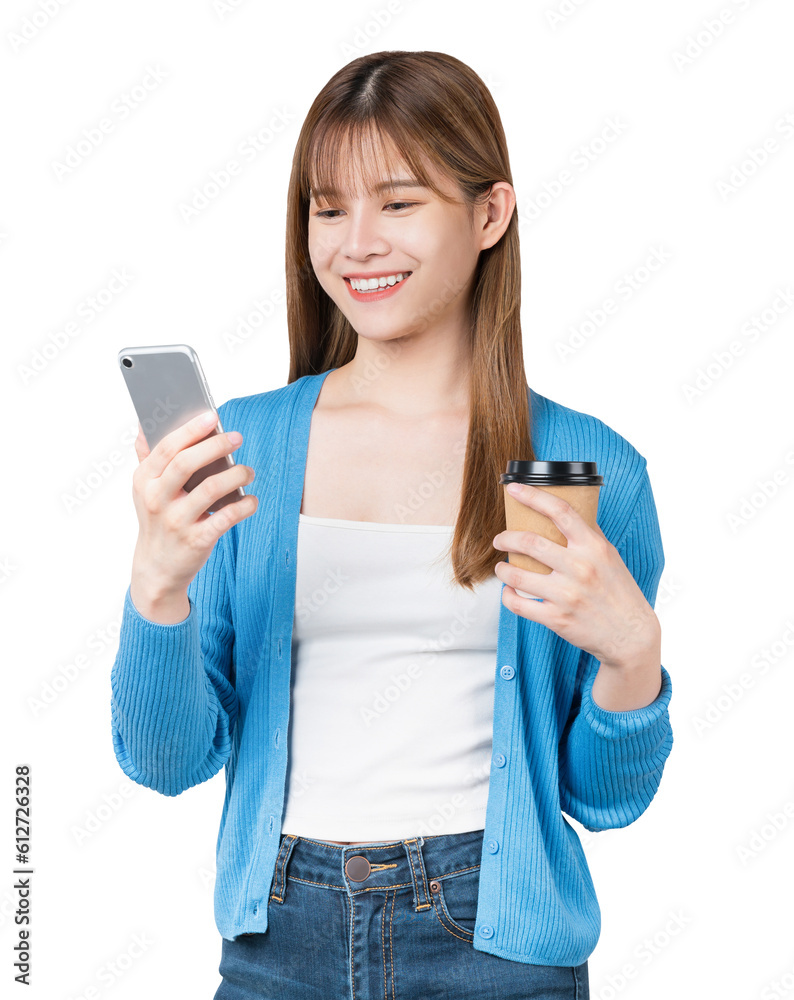 Young Asian woman holding smartphone and coffee cup on png background.