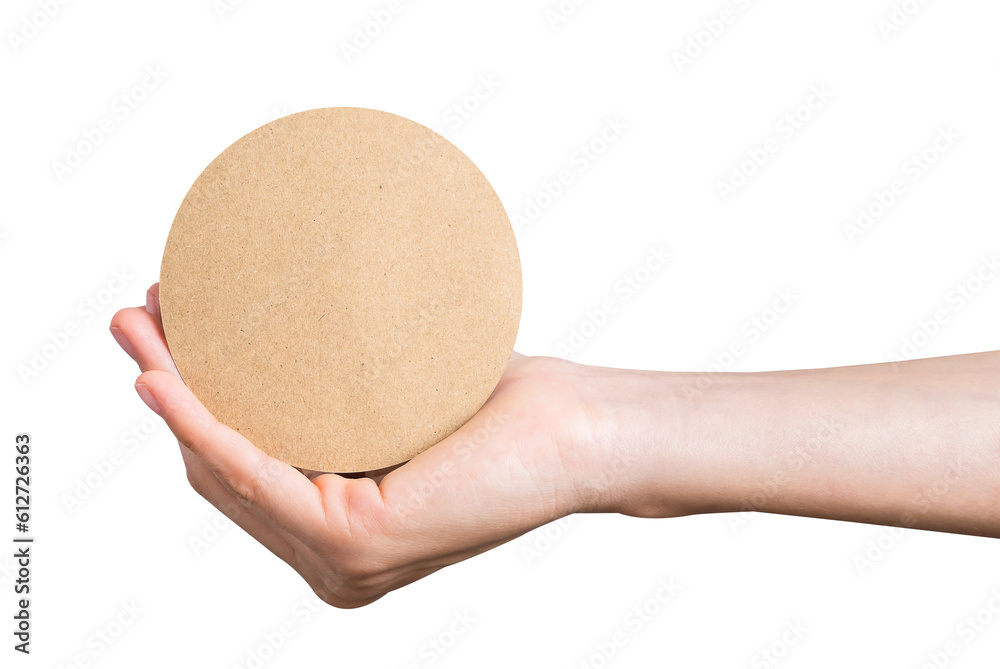 Hand holding circle sign brown paper on png background, empty space for text on ads.
