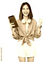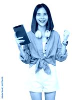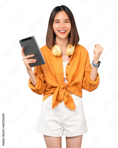 Cheerful young Asian woman in headphones listening to music and enjoy favourite playlist application on digital tablet with dancing on png background.