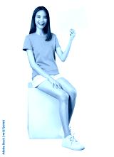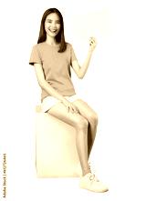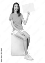 Smiling Asian woman sitting on box and hand holding paper speech bubble on png background., empty space for text on ads.