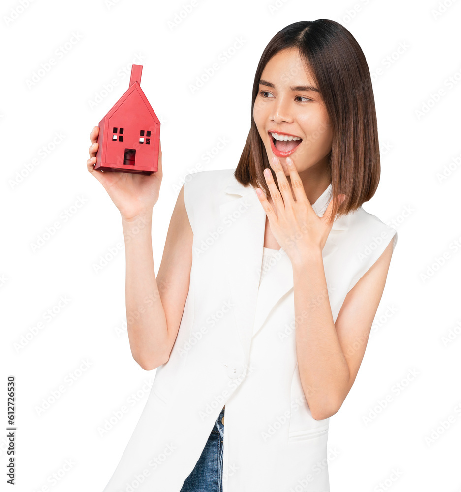 Beautiful Asian woman holding red home model, Concept real estate broker residential house for rent.