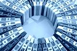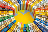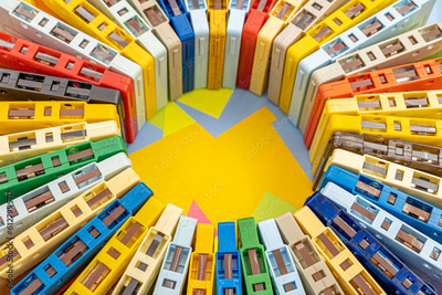 Top view of a collection of old vintage retro multicolored audio tape cassettes with a background of multicolored paper sticky notes