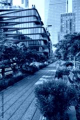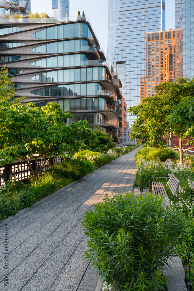 The High Line Park promenade in summer. Elevated greenway in Chelsea, Manhattan. New York City