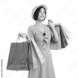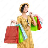 Young smiling asian woman holding multicolour shopping bags and looking on white background.