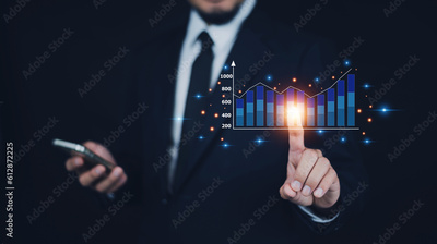 Businessman planning and strategy, Stock market, Business growth, progress or success concept. Businessman or trader is showing a growing virtual hologram stock, invest in trading.