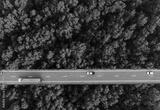 Aerial top view of car and truck driving on highway road in green forest. Sustainable transport. Drone view of hydrogen energy truck and electric vehicle driving on asphalt road through green forest.
