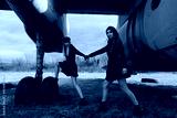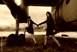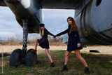 Two young stewardesses holding hands by the old plane
