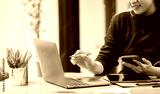 Young woman using mobile phone and laptop computer at office.
